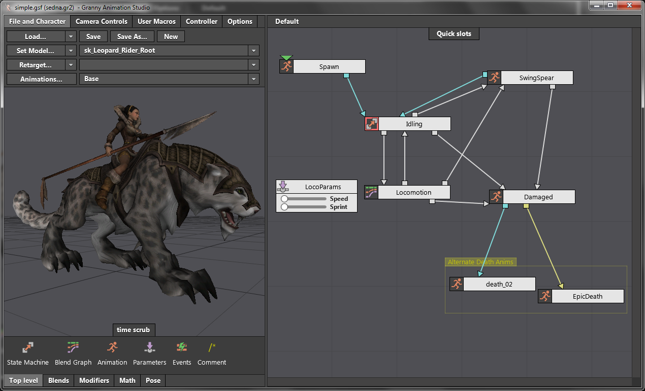 Granny's hierarchical state machine allows a character's behavior to be specified as a connected graph of animation states. These states are then connected with transitions that control how your character is allowed to move from one animation behavior to the next. Each state may be a blend graph, a simple animation, or a full state-machine, which makes it easy for artists to manage complicated behavior without being overwhelmed with detail.