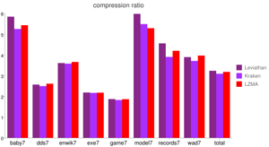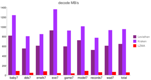 Leviathan : 3.23:1 , 0.9 enc MB/s , 642.4 dec MB/s LZMA : 3.18:1 , 3.0 enc MB/s , 53.8 dec MB/s Kraken : 3.09:1 , 1.3 enc MB/s , 948.5 dec MB/s zlib : 2.33:1 , 7.7 enc MB/s , 309.0 dec MB/s